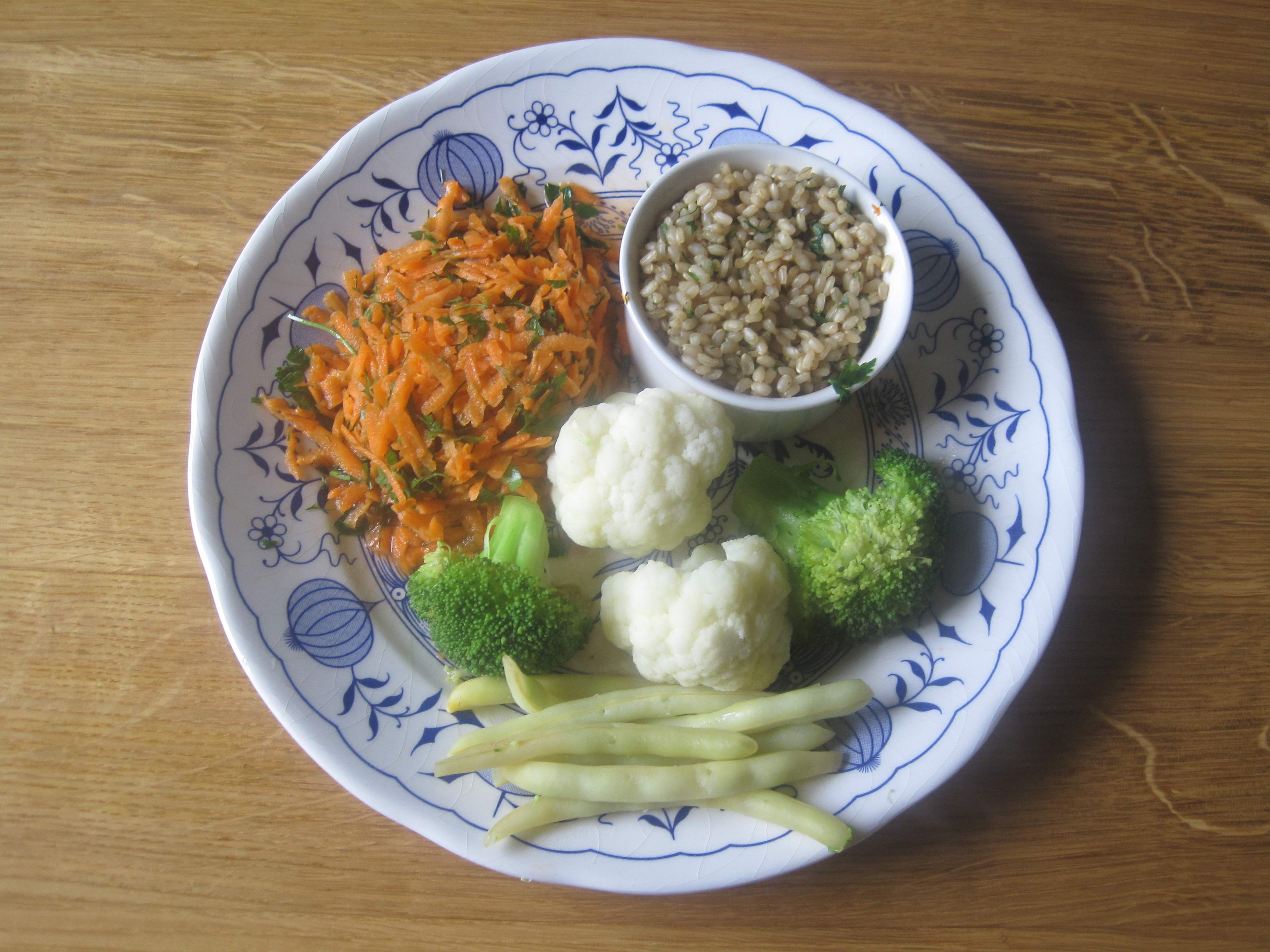 Pusdienas: Rīsi ar tvaicētiem dārzeņiem un burkānu salātiem =514kal