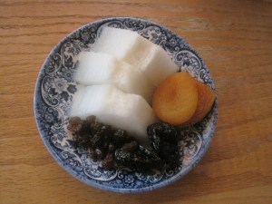augļi (2 žāvētas plūmes 24g =60kal; 2 aprikozes 29g. =70kal; 20 rozīnes 6g. =18kal)