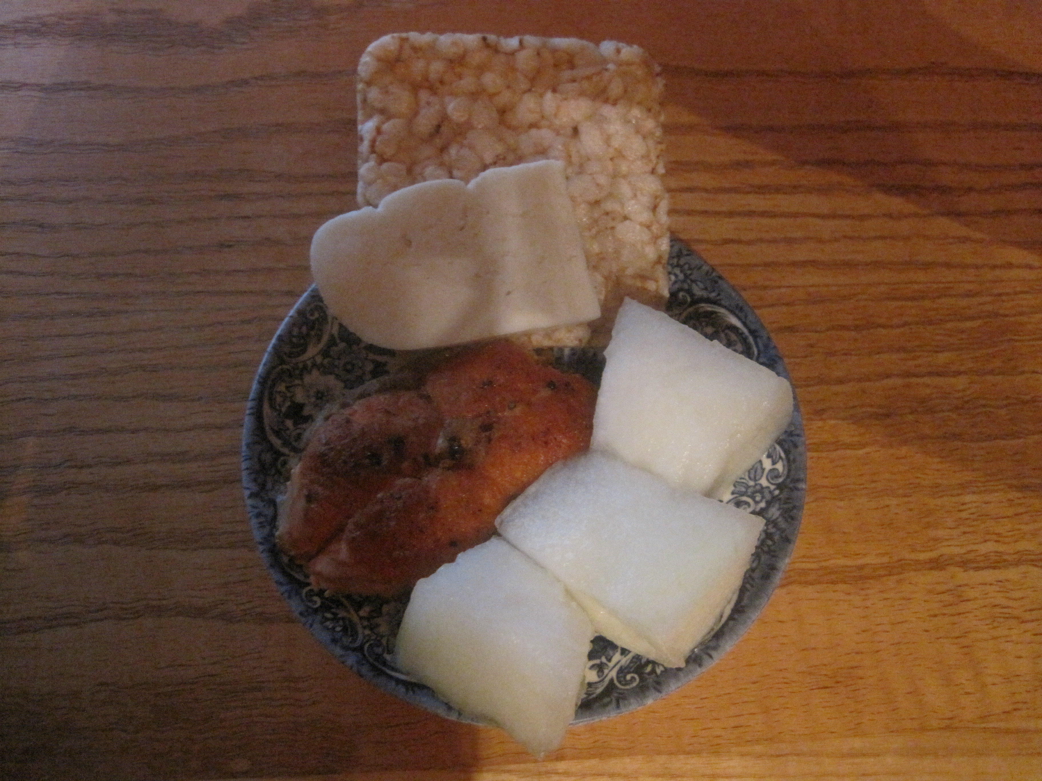 Vakariņas: Melone, lasis, kazas siers un rīsa galete =392kal
