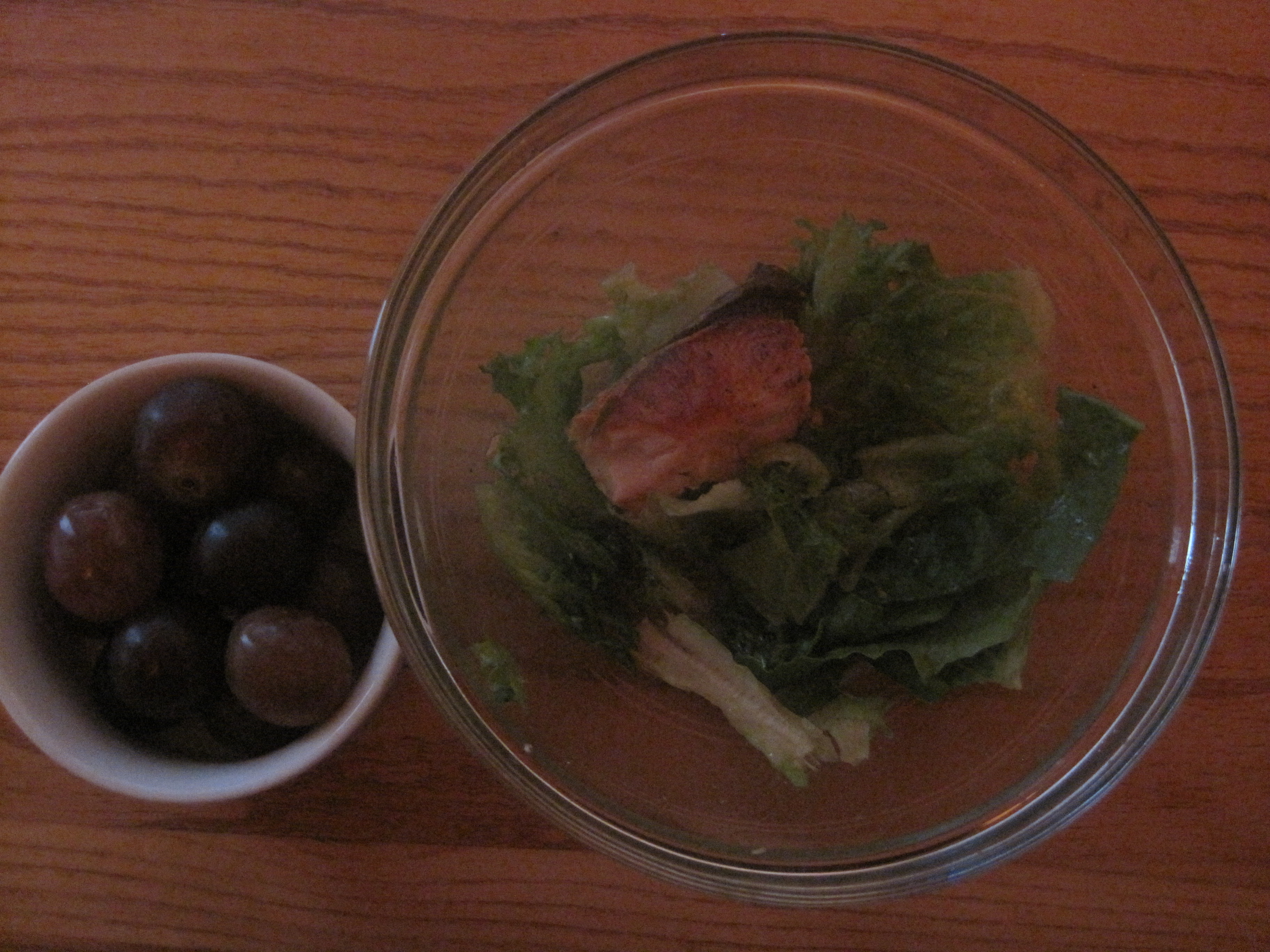 Vakariņas: Lasis ar salātiem (jau pusēsts) un vīnogām =388kal