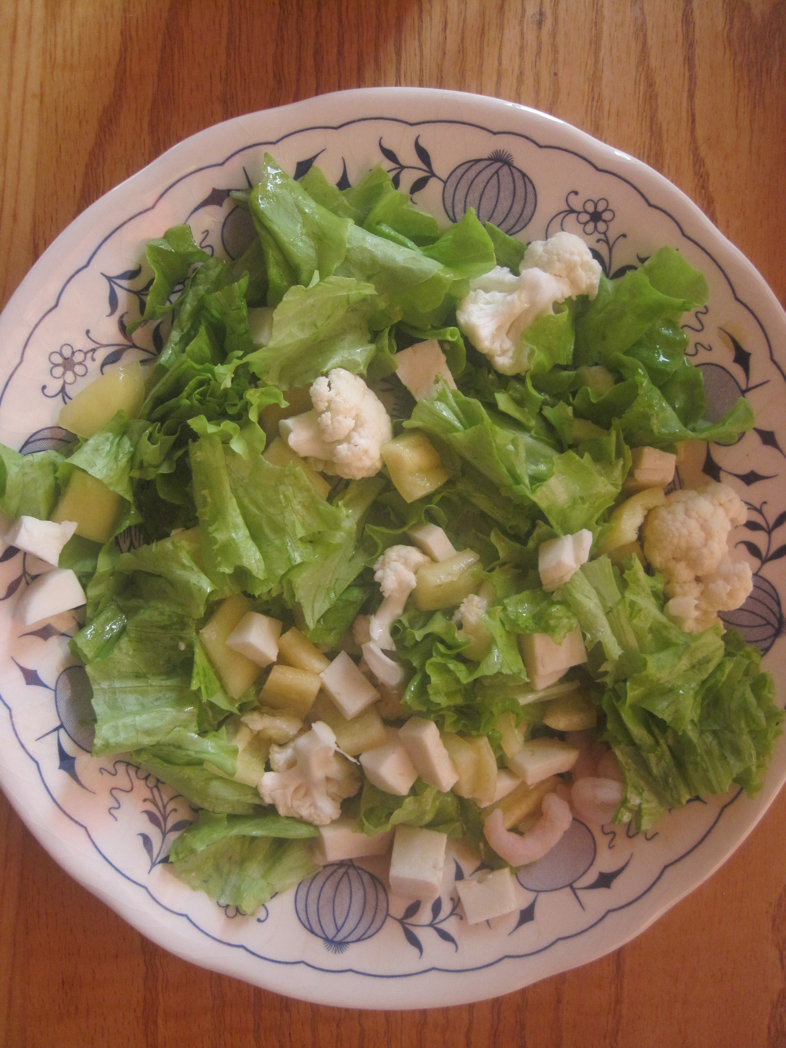Pusdienas: Salāti ar kazas sieru, mērci, dažām garnelēm =417kal