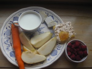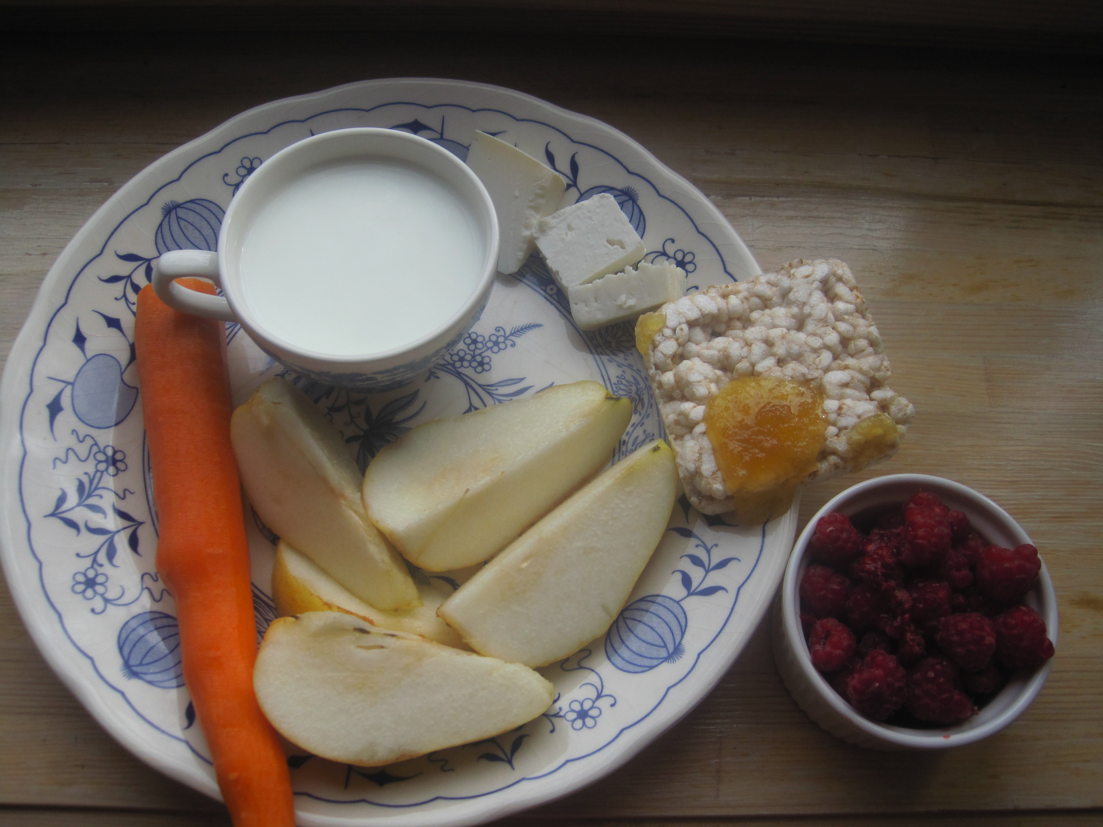 Brokastis: Citronūdens. Jogurts. Augļi, burkāns, sieri, rīsu galete ar medu =612kal