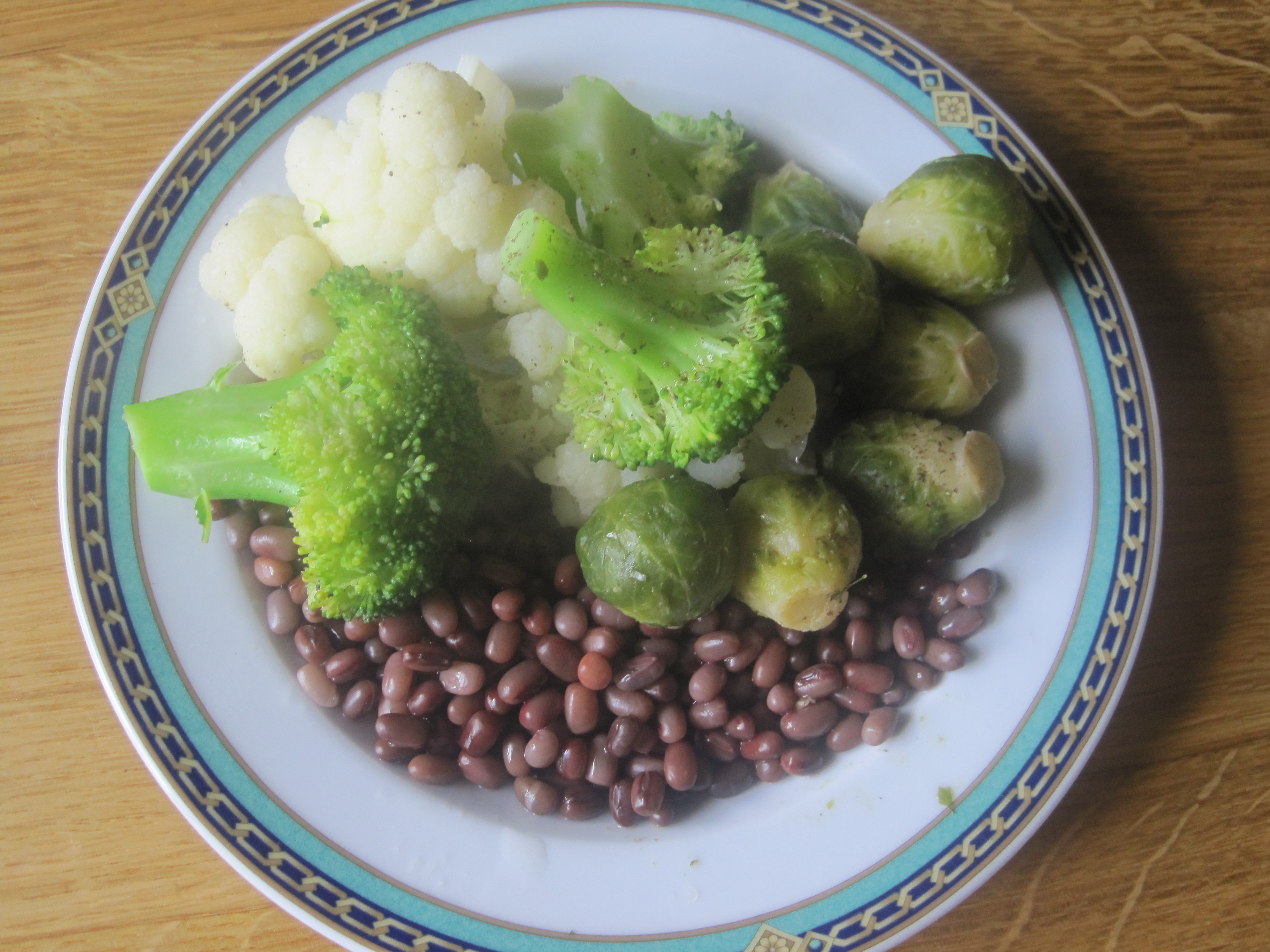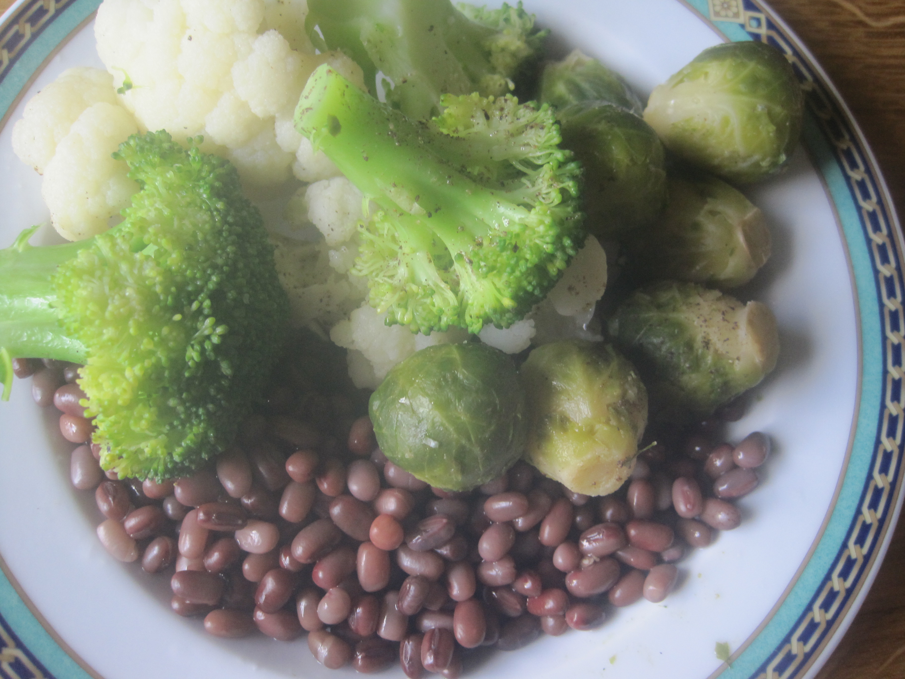 Pusdienas: Adzuki pupas ar briseles kāpostiem, brokoļiem un ziedkāpostiem =165kal